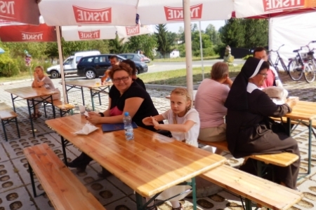 To wszystko za mało gdyby nie było grupy bardzo aktywnych i utalentowanych mieszkańców z panem Andrzejem Linkiem na czele, który odpowiednie inscenizacje przygotowuje, sam gra i śpiewa i mobilizuje do takiej działalności sporo ludzi – nawet kilku osobom z Rudy Milickiej po sąsiedzku udało się uczestniczyć w „Święcie wiatraka i misterium chleba”. Jak dodamy do tego wernisaż malarski Pani Bronisławy Nowackiej to niech żałuje ten co na tej imprezie nie był. A było tak: