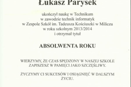 Można śmiało powiedzieć, że Łukasz tę myśl konsekwentnie realizował przez okres swojej nauki w Technikum w Zespole Szkół im. Tadeusza Kościuszki w Miliczu. Z wyróżnienia tytułem Absolwenta Roku bardzo jesteśmy dumni, tym bardziej że w ubiegłym roku nasza witryna Rudy Milickiej między innymi dzięki Łukaszowi dostała pierwszą lokatę w konkursie Aktywni w Dolinie Baryczy.