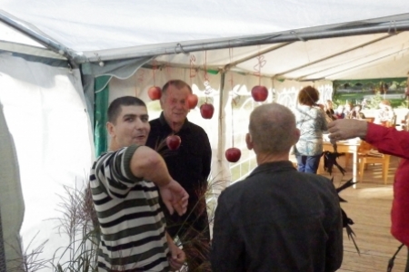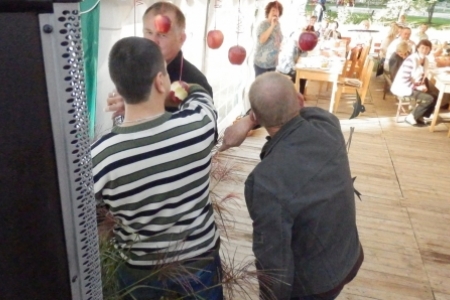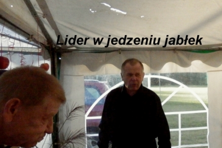 Na naszym festynie chodziło po prostu o sztukę zjedzenia fragmentu dekoracji nie posiłkując się dłońmi, choć można było sobie pomóc barkiem i łokciem. Trzech dzielnych panów stanęło do konkurencji ale najskuteczniejszą metodę przyjął pan Bolesław Pilipa, który w kilku kęsach pierwszy pochłonął jabłko – no i nie będzie szarlotki.