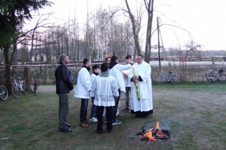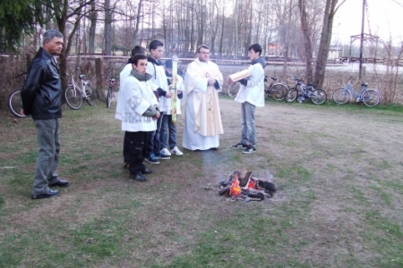 Przed wieczorną mszą święci się wodę, którą wierni mogą później zabrać do domów, następnie zaś wysokie ogniska rozpalane na kościelnych dziedzińcach. Od poświęconego ognia odpala się paschał (grubą, woskową świecę), który będzie się palił podczas wszystkich nabożeństw wielkanocnych.