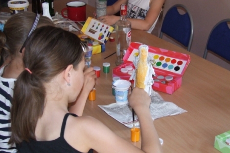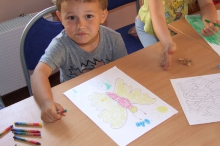 Tematem przewodnim dzisiejszych naszych zajęć plastycznych były motyle malowane przez najmłodsze dzieci. Tydzień temu starsze dzieci wykonywały wazony z butelek i oklejały gazetą. W tym tygodniu kończyły wazony malując je farbami plakatowymi.