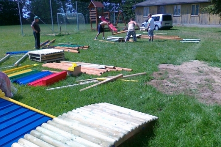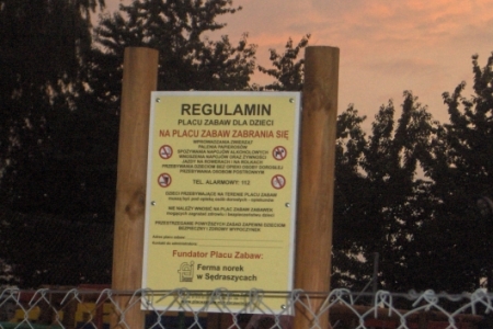 Życzymy dzieciom i rodzicom przyjemnego korzystania z tego Placu Zabaw , jednak wg regulaminu, który zawisł na dwóch belkach przy wejściu.