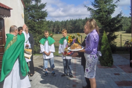 Z tegorocznych zbóż upletliśmy piękny wieniec a ze zboża pachnący chleb i udaliśmy się do naszej kaplicy, w której w niedzielę odbyła się msza św. dożynkowa podczas której mieszkańcy naszej miejscowości złożyli dary w postaci wieńca i chleba.