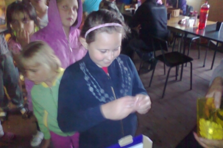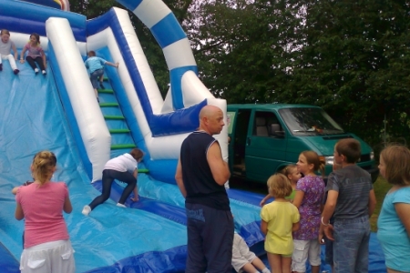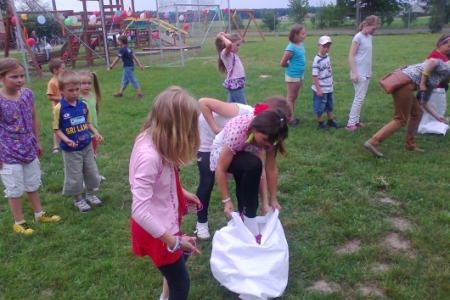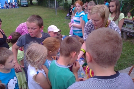 Przez deszcz nie można było jak co roku smażyć kiełbasek na ognisku, ale i ztym organizatorzy poradzili sobie świetnie. Kiełbaski były z patelnii. Wszystkie dzieci dostały prezenty..