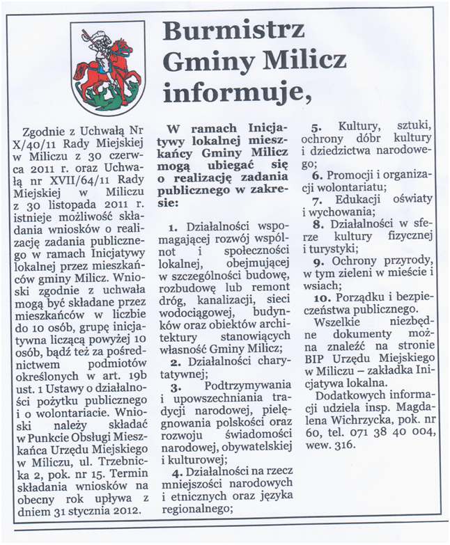 BURMISTRZ GMINY MILICZ INFORMUJE