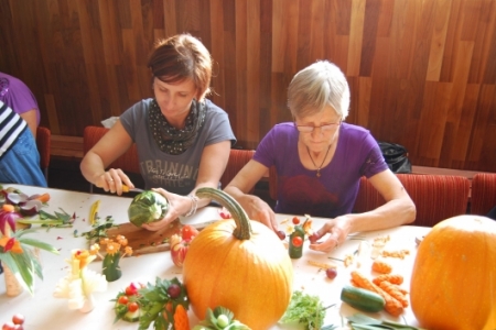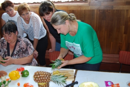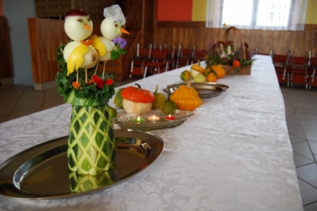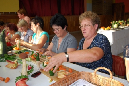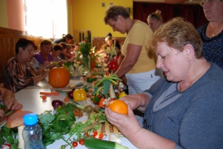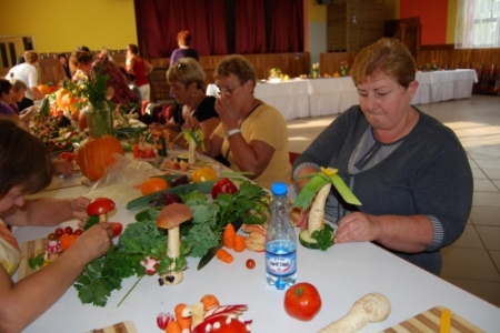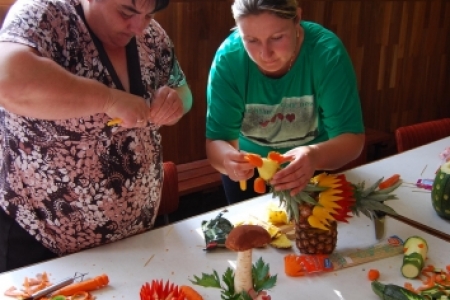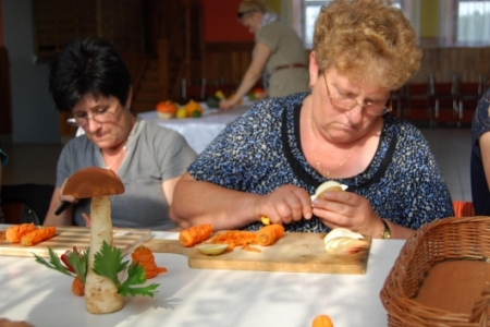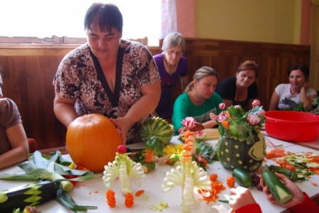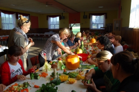 Warsztaty carvingu przeprowadziły członkinie Koła Gospodyń Wiejskich w Chynowej. Udział w nich wzięli przedstawiciele następujących sołectw: BUKOWINKA, CHOJNIK, GRANOWIEC, PAKOSŁAWSKO, JANKOWA, BUKOWICE, LĘDZINA, POTASZNIA i GóRY. Łącznie w warsztatach uczestniczyło 35 osób. Wśród kobiet, które postanowiły spróbować swoich sił w dziedzinie dekoracji warzyw i owoców tzw. „carvingu”, znalazł się również jeden pan. Widać było ogromne zainteresowanie tą techniką i jednocześnie fascynację. Materiały wykorzystane podczas zajęć zostały zapewnione przez Stowarzyszenie „Partnerstwo dla Doliny Baryczy”.