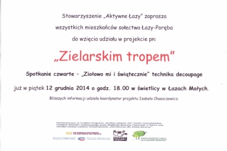 12 grudnia - warsztaty czwarte w ramach projektu "Zielarskim tropem" - "Ziołowo mi i świątecznie" technika decoupage od godz. 18.00 w świetlicy w Łazach Małych