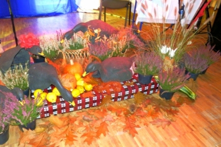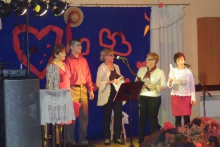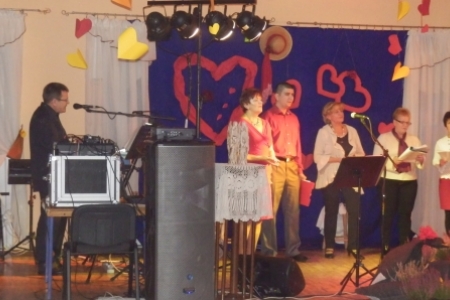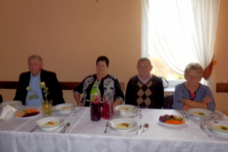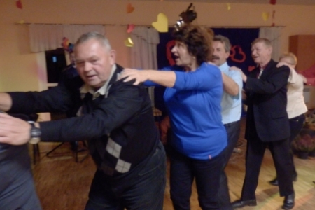 Około 50 osób, z dwóch współpracujących ze sobą wsi, zgromadziło się przy stołach w świetlicy. Zespół „Za ostatni grosz” przygotował na tę uroczystość spektakl słowno – muzyczny traktujący o smutkach i radościach wieku dojrzałego. Zdecydowanie więcej było radości bo „… na razie fruwają motyle, tyle tego tam tego wciąż tyle…” i przecież nie będziemy przejmować się tym, że coś się zapomni, a gdzieś będzie strzykać.