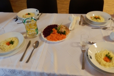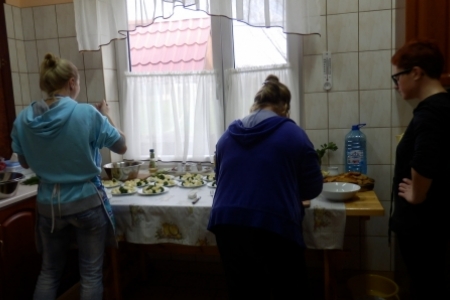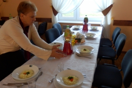 Dania były nie tylko dobre, ale też pięknie przygotowane a wszystko na czas – organizacja lepsza niż w niejednej renomowanej restauracji. No i do tego jeszcze pan Sołtys, który podawał do stołu. Pan Sołtys i Seniorzy podziękowali brawami i śpiewając duchowiankom, przygotowującym obiad, sto lat.