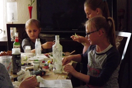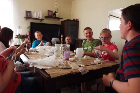 Dzieci i młodziez z zespołu „Pierścienie” podczas przygotowania do Dnia Mamy, przygotowały dla nich samodzielnie wykonane przez siebie wazony, lampiony czy flakoniki. Efekt był bardzo ładny.
