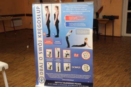 Bóle pleców to plaga współczesnych społeczeństw.Dotykają wszystkich bez względu na wiek.Mogą być wynikiem poważnych schorzeń,z reguły są rezultatem zaniedbań.Tymczasem zachowanie zdrowia i dobrej kondycji naszych pleców nie jest trudne – wymaga jedynie cierpliwości, determinacji i zapamiętania kilku podstawowych zasad. Dlatego powstał pomysł na lokalny projekt zdrowotny, którego celem jest połączenie wiedzy o kręgosłupie z cotygodniowymi godzinnymi ćwiczeniami fizycznymi, prowadzonymi pod wprawnym okiem instruktorki - Joanny Ludwiczak, która dobrała odpowiednie rodzaje i zestawy ćwiczeń.Pierwsze spotkanie było wprowadzające i miało na celu omówienie funkcji kręgosłupa oraz dolegliwości jakie najczęściej powstają z takich powodów,jak: brak ćwiczeń, długotrwała praca siedząca, niewygodne miejsce pracy,stres itd.Tematykę tych spraw omówił Pan Marek Tomczyk - dyplomonwany specjalista ds rehabilitacji.Dwugodzinna tematyczna prelekcja połączona z pokazem multimedialnym oraz prezentracją sprzetu do ćwiczeń - przykuwała uwagę zainteresowanych poprawą zdrowia.