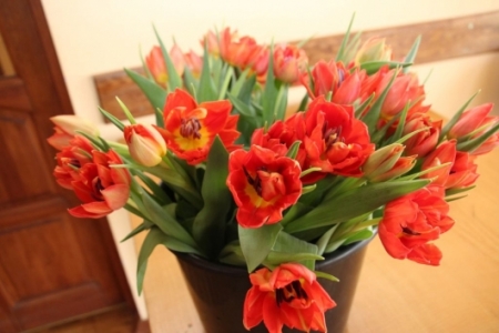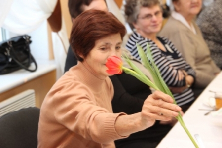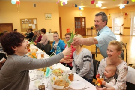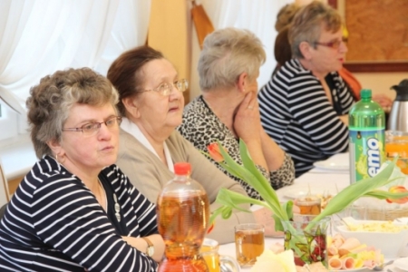Wszystkie Panie oprócz gorących życzeń,które złożył Jerzy Nowacki - sołtys Duchowa, otrzymały tradycyjnie czerwonego tulipana.Później był poczestunek. Podawano kawę,herbatę,ciasto,napoje,były sałatki, były również dania gorące.W tym dniu odwróciły się zwyczajowe role,nie mogło być inaczej: Panie ,mające status gości spotkania, wygodnie zasiadły za zastawionym stołem,a Panowie w całości przęjeli rolę gospodarzy, którzy od początku do końca trwania spotkania usługiwali Paniom, bardzo sprawnie wywiązując się z tej roli.