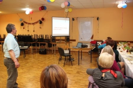 Kiedy atmosfera spotkania nieco się rozluźniała - przyszedł czas na wspólną zabawę. Bardzo trafionym pomysłem okazała się zabawa w karaoke.Wyświetlane na ekranie teksty popularnych i biesiadnych piosenek wraz z akompaniamentem - rozbawiły wszystkich na 100%. Bo chyba nic tak nie integruje ludzi,jak właśnie wspólny stół i wspólne śpiewanie.Dobry nastrój i humor utrzymywał się przez cały czas trwania spotkania.Radość ze wspólnego spiewania była ogromna.W pewnym momencie,aż chciało się zgodzić z poetą i jego słowami; "gdzie słyszysz śpiew, tam wejdź, tam dobre serca mają...".