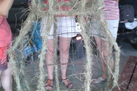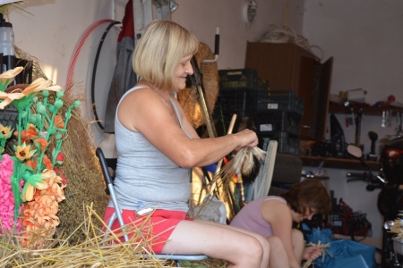 ETAP 4 - Rozpoczynamy. Kilka dni wytężonej pracy, najpierw uzupełnienie stelaża siatką, następnie rozpoczęłyśmy plecenie: zboża, kwiaty, len, zatrwian i wszystko układa się w piękną całość. Teraz jeszcze tylko wykończenie - panie Maryla i Agnieszka przygotowały piękne kwiaty z nasion dyni i czerwonej fasoli.
