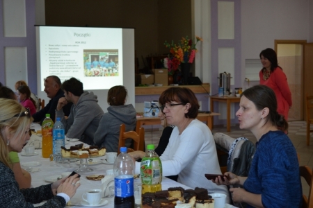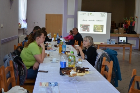 Spotkanie rozpoczęło się od serwisu kawowego, podczas którego grupa obejrzała prezentację „Łazy– wioska ziołowa”, a także miała okazję spróbować ciast upieczonych przez mieszkanki.