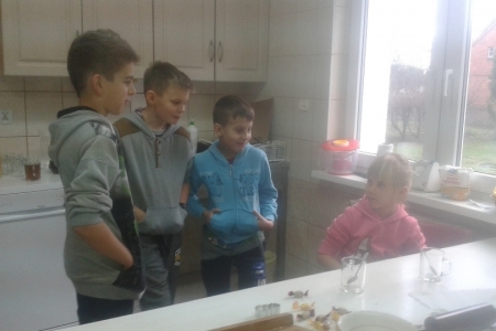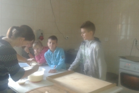 Najpierw każde z przybyłych dzieci ubijało jajka z cukrem, następnie wyrabiało ciasto na jednolitą masę, rozwałkowało ciasto i wycinało foremkami: gwiazdki, choinki, bałwanki, mikołaje, serca.