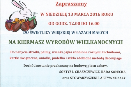 4.Zapraszamy W NIEDZIELĘ 13 MARCA 2016 ROKU OD GODZ. 12.00 DO 16.00 DO ŚWIETLICY WIEJSKIEJ W ŁAZACH MAŁYCH NA KIERMASZ WYROBÓW WIELKANOCNYCH