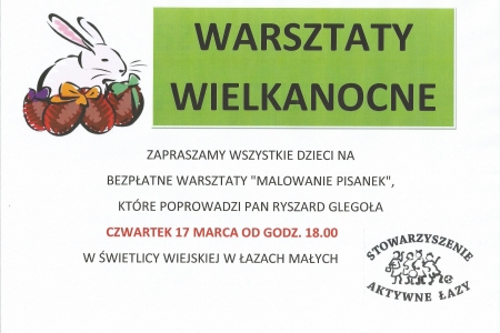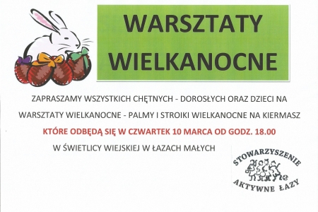 3.Zapraszamy wszystkich chętnych - dorosłych oraz dzieci na Warsztaty wielkanocne - palmy i stroiki wielkanocne na kiermasz, które odbędą się w czwartek 10 marca od godz. 18.00 w świetlicy wiejskiej w Łazach Małych.