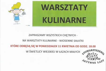 1. Warsztaty kulinarne odbędą się w poniedziałek 11 kwietnia od godz. 18.00 w świetlicy wiejskiej w Łazach Małych. Temat przewodni to wiosenne sałatki.