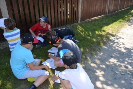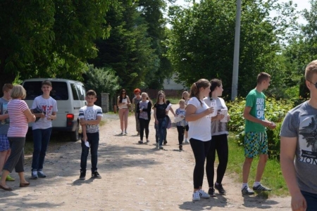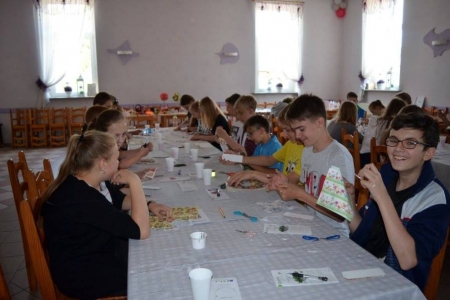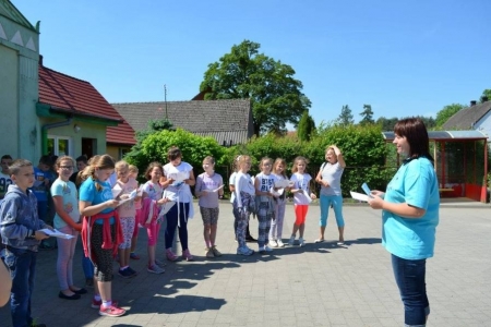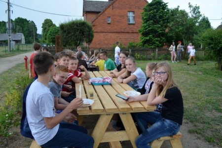 24.05.2016 przyjechały do nas klasy pierwsze z Zespołu Szkół w Bukowicach. Przyznać musimy, że ta grupa najdokładniej szukała skarbu, słuchała swoich opiekunów, zwiedzała okolicę... Po odnalezieniu skarbu, wszyscy przybili sobie pamiątkową pieczątkę i przystąpiliśmy do zajęć. Dziś uczniowie wykonali aniołki z masy solnej, a na zakończenie zasiedliśmy w naszym przyświetlicowym zakątku aby zjeść upieczoną na ruszcie kiełbaskę. Dziś było bardzo gorąco, więc na stole czekała nasza "ziołanka" czyli woda z cytryną i miętą...