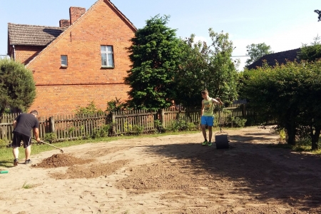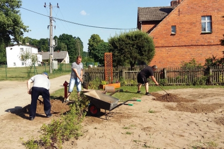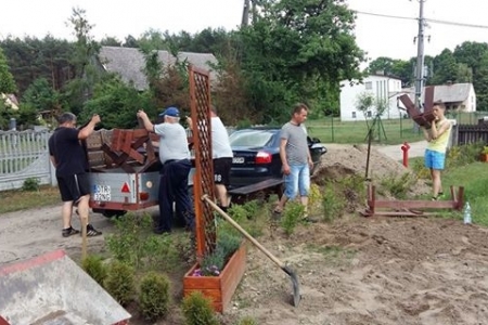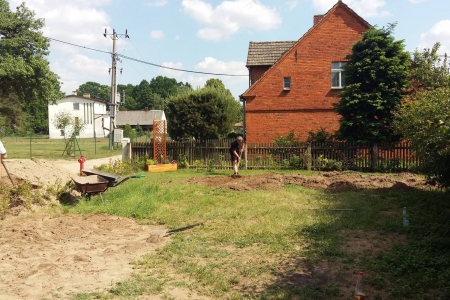 Projekt powoli się kończy, ale jeszcze trochę pracy mamy do wykonania. W sobotę grupa mieszkańców spotkała się przy świetlicy, aby wyrównać obsadzony teren, ponieważ w końcu udało nam się pozyskać nieodpłatnie ziemię. Przy okazji obsypaliśmy rośliny korą, oraz pomalowaliśmy stół i ławki. Jeszcze tylko wysiejemy trawę, ustawimy pergolę i obudowę koszy na śmieci i koniec