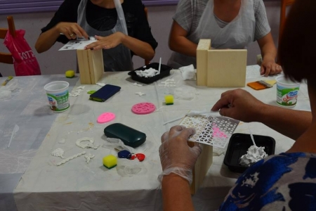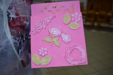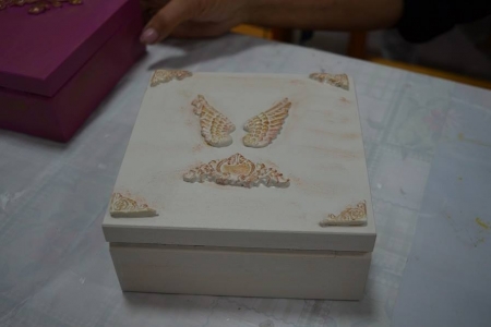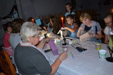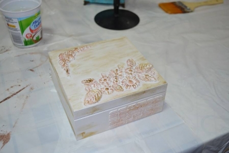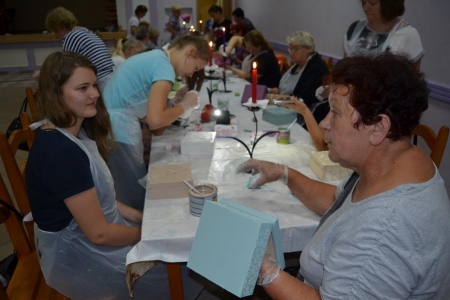 Na warsztatach licznie zgromadzone panie wykonały szkatułki - herbaciarki poznając nowe techniki rękodzielnicze: wyciski z foremek silikonowych z masy typu Das, wzory z szablonów wykonane pastą strukturalną, zastosowanie past pozłotniczych oraz tzw. malowanie suchym pędzlem, aby nadać koloru szczegółom. Choć za oknem szalała wichura i przez jakiś czas pracowałyśmy przy świecach bo nie było prądu, udało się paniom wykonać szkatułki i choć każda wykonana tymi samymi technikami, każda była inna w zależności od upodobań właścicielki, zastosowanych wycisków i kolorów.