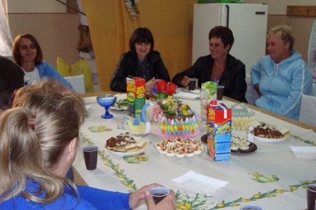 Przyszedł czas na przywitanie ,więc pani sołtys oraz pani przewodnicząca złożyły wszystkim obecnym życzenia , które odwzajemniły,podzieliłyśmy się jajeczkiem.Czas upłyną w miłej atmosferze.Były wspomnienia z lat młodzieńczych oraz żarty ,którym nie było końca.