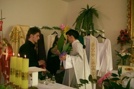 W niedzielę 29 maja w naszej nowo wyremontowanej Kaplicy w Dziadkowie obchodziliśmy 15-stą rocznicę święceń kapłańskich naszego proboszcza Krzysztofa Tomczaka. Parafianie z Dziadkowa, Rakłowic i Grzebielina z tej okazji złożyli księdzu życzenia, obdarowali go pięknymi bukietami kwiatów oraz złożyli mu w darze trzy piękne ornaty, albe, komże, bieliznę kielichową, welon, obrusy. Ksiądz proboszcz nie ukrywał radości z otrzymanych prezentów, mówiąc '' to znaczy że dbacie o swojego proboszcza i chcecie żeby dobrze wyglądał ". Pod koniec mszy z uśmiechem na ustach składał podziękowania dla parafian, sponsorów i ludzi dobrej woli którzy przyłożyli się do odnowienia i wysprzatania naszej kaplicy.