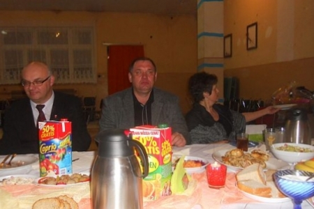 W TRAKCIE ZABAWY ZAWITALI GOŚCIE Z PREZENTAMI – WóJT IGNACY MIECZNIKOWSKI ORAZ RADNY GMINY CIESZKóW WACŁAW KORDA.