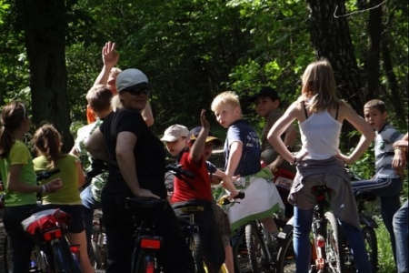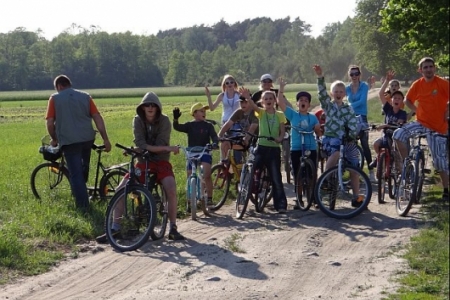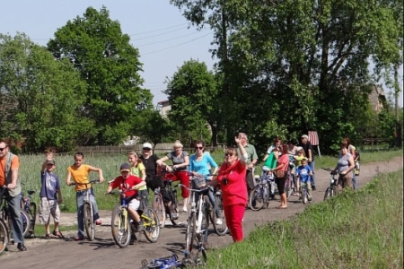MAMY SOBOTE, SŁONECZNE POPOŁUDNIE. W CETRUM SOŁECTWA GROMADZĄ SIĘ MIESZKACY NA RAJ ROWEROWY, KTóRY ZOSTAŁ ZORGANIZOWANY PRZEZ PANIĄ SOŁTYS I CZŁONKóW RADY SOŁECKIEJ ORAZ KORDYNATORA JANKA SZYMAŃSKIEGO.