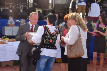 DELEGACJA ( W SKŁADZIE 11 OSóB ANIELA BŁASZCZYŃSKA, MARCIN MRUK, EUGENIUSZ PIOTREK BARBARA KLECZEWSCY, JULITA JUSZKIEWICZ, RADEK KOŁODZIŃSKI, MARTA IZYDORCZYK, RADEK GALEWSKI , JAN SZYMAŃSKI GABRIELA MARCISZEWSKA) WRĘCZYŁA GOSPODARZĄ DOŻYNEK CHLEB, KWIATY POLNE I WARZYWA , OWOCE ZWANE PŁODAMI ŻNIW I OD CZYTAŁA PRZEPIĘKNĄ PRZEMOWĘ O POCHODZENIU WIEŃCA Z KRóLESTWA DOLINY KARPIA.