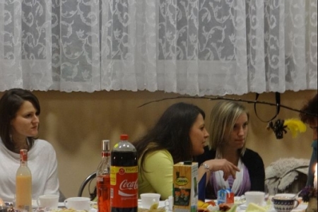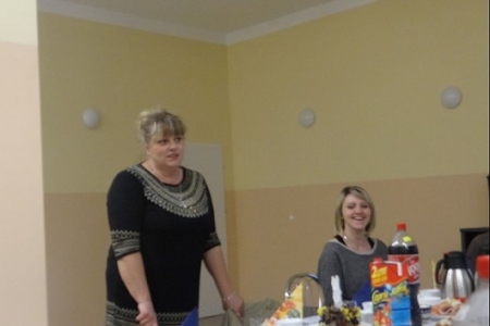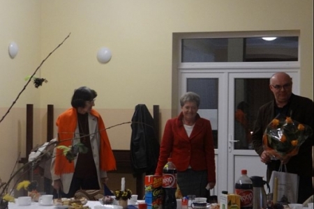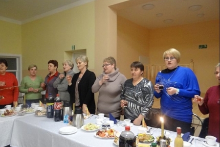 DOCHODZI GODZINA 19.00 ZBIERAJĄ SIĘ PANIE W ŚWIETLICY WIEJSKIEJ. PANIE OGLĄDAJĄ I PODZIWIAJĄ ŚWIETLICE PO NIEDAWNYM REMONCIE. PRZYBYWAJĄ ZAPROSZENI GOŚCIE PANI DYREKTOR GCK W CIESZKOWIE HALINA NIEDBAŁA ORAZ WóJT IGNACY MIECZNIKOWSKI. Z ŻYCZENIAMI WRĘCZYLI UPOMINKI NASZYM PANIĄ. GOŚCIE ZWRóCILI UWAGĘ NA PTASZKI, GDZIE NASTĘPNIE NASZA MIESZKANKA WRĘCZYŁA IM SZYSZKOWE OZDOBY.