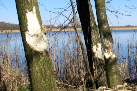 Podczas świątecznego spaceru po naszych stawach natknęliśmy na dość niezwykły widok.Otóż przy drodze głównej tuż przy łowisku na porośniętej drzewami grobli- drodze zobaczyliśmy efekty pracy największych po człowieku ssaczych konstruktorów - bobrów.W nietypowym miejscu ,bo przy samej drodze dość uczęszczanej szczególnie latem,te sympatyczne ssaki urządziły sobie ćwiczenia.Kilka pokaźnych rozmiarów drzew zostało fachowo przygotowane do powalenia.Myślę,że prace te miały charakter typowo konsumpcyjny. Ze względu na bliskość wody spuszczone drzewa można łatwiej transportować w dowolne miejsce.Poza tym leżące drzewo w wodzie dłużej zachowuje swoją świeżość.Tak zmagazynowane może stanowić budulec, lub smakołyk na gorsze czasy.