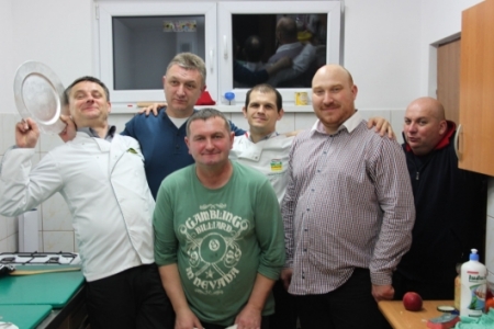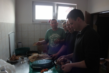 Wszystko przygotowywali sami. Od samego rana w kuchni uwijali się : Paweł , Andrzej, Tomek, Rafał, Krzysiek. Do drużyny troszkę póżniej dołączył również Darek. A przygotowali same pyszności. Czytajcie i zazdrośćcie. Kotlety schabowe z żółtym serem, ananasem i żurawiną – pyszota! Pulpeciki w winie z sosikiem czosnkowo-chrzanowym – mhhhmmm! Udka z kurczaka w ziarnach słonecznika i orzechach laskowych – no niebo w gębie! sałatki – chyba z pięć rodzajów! Półmiski z wędlinami- rewelacja! No i gwóźdź programu – udziec z dzika z kaszą – i tu brakuje słów , żeby opisać jaki był dobry…
