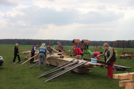 W dniu 12 kwietnia spotkaliśmy przy świetlicy, żeby kontynuować nasze dzieło budowy wiaty.Chętnych do pracy okazało się kilkanaście osób! Na samym początku nastąpił oczywisty podział obowiązków czyli : Kobitki do wiader z farbą i pędzlami !, mężczyźni do łopat, młotków itp.! A dzieci – na plac zabaw! Może i zabrzmiało to dziwnie, ale tak właśnie było. Dzięki tak sprawnej organizacji nikt sobie nie wchodził w drogę i przysłowiowo „nie plątał się pod nogami”.
