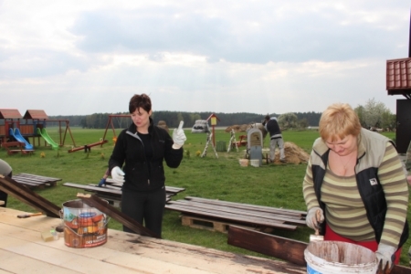 Najpierw oczywiście deski trzeba było oczyścić z resztek trocin ,a następnie pomalować na piękny brązowy kolor impregnatem do drewna. Pędzle aż furczały w powietrzu. Od czasu do czasu niewiasty robiły sobie przerwę