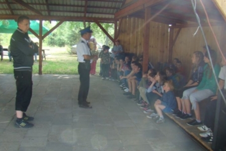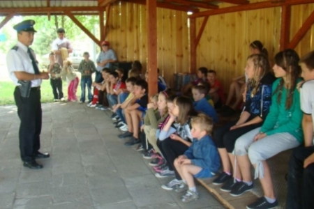 Wszyscy z uśmiechem wjechali do Bukowinki na plac rekreacyjny gdzie oczekiwały na nich pozostałe atrakcje np. pogadanka o bezpieczeństwie z panem policjantem oraz pieczone kiełbaski.