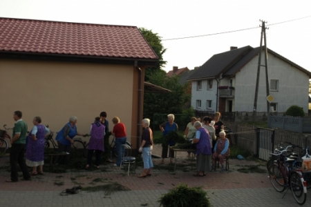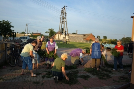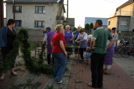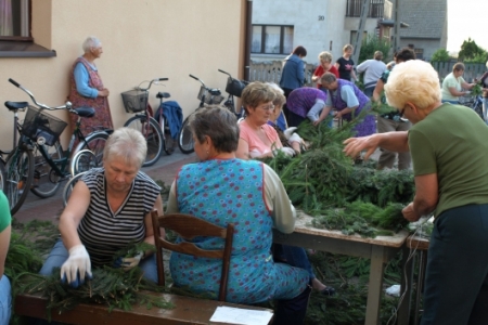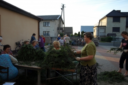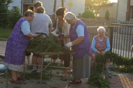 W sobotę 11 czerwca rozpoczęliśmy wspólne przygotowania do nawiedzenia kopii obrazu Matki Boskiej Częstochowskiej. W godzinach rannych panowie z naszej wioski wyjechali po gałęzie świerku które miały służyć do wykonania girland na powitanie obrazu. Pod salą wiejską i remizą spotkali się mieszkańcy Gorzyc Małych w przeważającej ilości kobiet do wspólnego wykonywania ozdób. Jak widać na załączonych zdjęciach nasi mieszkańcy oprócz pracy znaleźli czas na kawę i placek oraz na rozmowy o przygotowaniach do nawiedzenia obrazu.