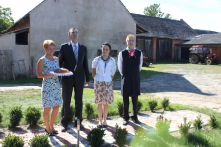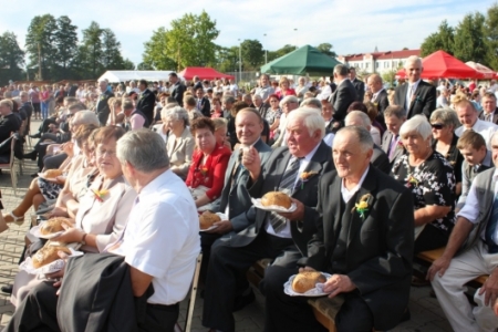 Po mszy świętej starosta i starościna tegorocznych Gminnych Dożynek: pan Maciej Śniatała i pani Anna Fiłka z Granowca wręczyli chleb księdzu proboszczowi Zdzisławowi Naglerowi, a następnie przekazali go Wójtowi Gminy Sośnie – Krzysztofowi Bochenowi.