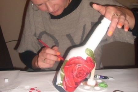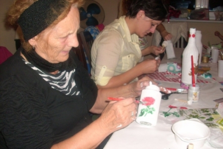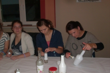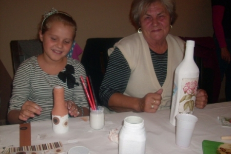 Druga grupa osób natomiast doskonaliła się w technice zdobienia przedmiotów metodą decoupage. Tematem przewodnim zajęć był decoupage na szkle. Do wyboru były butelki po sokach, winie i kawie, które po nałożeniu na nie farb i przyklejeniu serwetek okazały się nie do poznania.