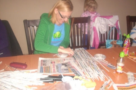 Popularność papierowej wikliny nie słabnie, stąd też kolejne warsztaty. Tym razem uczestnicy warsztatów przekonali się jaką miłą umiejętnością jest wyplatanie koszyków. Krok po kroku powstawały koszyki, które trwałością nie ustępują klasycznej wiklinowej plecionce. Zachęcając uczestników jeszcze bardziej do rozpoczęcia wspaniałej przygody z papierową wikliną dodatkowo zaprezentowano jak zrobić świąteczną choinkę.