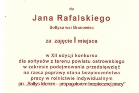 Sołtys naszej wsi zajął I miejsce w XII edycji konkursu dla sołtysów z terenu powiatu ostrowskiego w zakresie podejmowania przedsięwzięć na rzecz poprawy bezpieczeństwa pracy w rolnictwie indywidualnym.