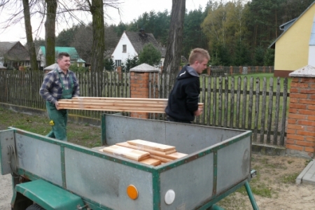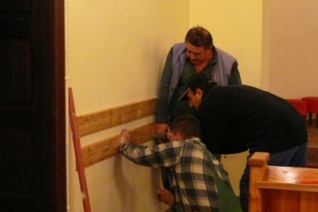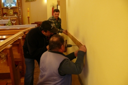 W środę 18 kwietnia panowie: Adam Skrzypczyk, Sławomir Kasprzyk oraz Tomasz Szymonik montowali w kościele przygotowane przez Tomasza Szymonika listwy na ścianach, które mają poprawić estetykę wnętrza i jednocześnie przeciwdziałać brudzeniu się odzieży. W porządkowaniu po realizacji zadania pomagała pani Sołtys.