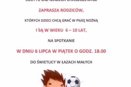 SOŁTYS ŁAZ IZABELA CHASZCZEWICZ ZAPRASZA RODZICóW, KTóRYCH DZIECI CHCĄ GRAĆ W PIŁKĘ NOŻNĄ I SĄ W WIEKU 6 – 10 LAT, NA SPOTKANIE W DNIU 6 LIPCA W PIĄTEK O GODZ. 18.00 DO ŚWIETLICY W ŁAZACH MAŁYCH