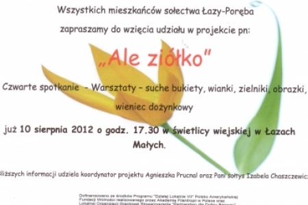 Już 10 sierpnia 2012 o godz. 17.30 w świetlicy wiejskiej w Łazach Małych odbędą się kolejne warsztaty w ramach projektu „Ale Ziółko”. Tematem przewodnim jest susz roślinny. Zajmiemy się wykonaniem suchych bukietów, wianków, zielników, obrazków, oraz opracujemy koncepcję wieńca dożynkowego.