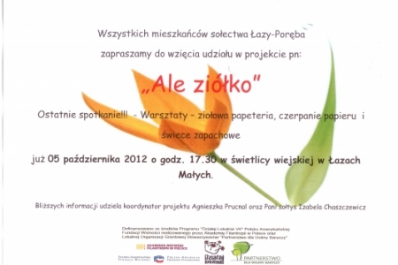 Już jutro 5 października zapraszamy do świetlicy na godzinę 17.30 na ostatnie warsztaty z cyklu "Ale Ziółko". Tym razem nauczymy się czerpać papier, robić ziołowe papeterie, wykonamy również świece, gdyż ostatnio zabrakło nam na to czasu.
