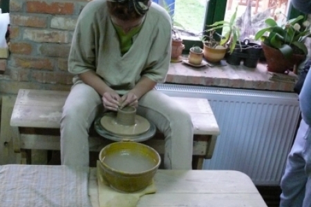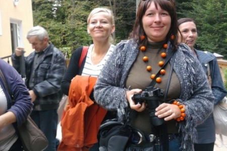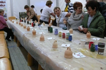 Uwieńczeniem tego dnia był pobyt w Kamionce „Garncarskiej wiosce”- przedsiębiorstwie społecznym. Duże zainteresowanie wzbudził „Ogród rajski”, chociaż obecnie jest w realizacji , to już robi ogromne wrażenie. Ogród zakładany jest na planie drzewa, którego „konary” będą w ogrodzie alejami łączącymi ogródki tematyczne, m.in.:skalny, rajski, edukacyjny, wrzosowy, muzyczny, ziołowy, różany oraz zakątek bajkowy ze stołem, na którym dzieci będą mogły „wyczarować” sobie zabawki z szyszek, żołędzi i kasztanów. Jest ogród tajemnic z labiryntem, rośliny są jeszcze małe, więc łatwo udało się nam go przejść. Przyszła pora na obiad, po spacerze w ogrodzie wszystkim dopisywał apetyt, jedzenie było przepyszne. Po chwili ruszyliśmy zwiedzać dalszą część „Wioski garncarskiej”- mieliśmy pokaz toczenia na kole garncarskim. Sami mieliśmy okazję ozdobić wyrób z gliny, dostaliśmy dzwoneczki do malowania. Każdy starał się ozdobić swój dzwonek jak najładniej, ale nie było to takie proste. Mogliśmy również zakupić pamiątki w sklepie funkcjonującym na terenie przedsiębiorstwa. Były tam wyroby z „Garncarskiej wioski” jak i okolicznych rękodzielników. Ponownie spotkaliśmy się z panem Krzysztofem Margolem, który przedstawił nam marketing wioski tematycznej. Pożegnano nas kolacją i wieczorem mazurskim przy akordeonie i miodzie pitnym.