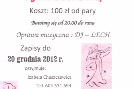 Zapraszamy również na organizowaną przez Sołtys i Radę Sołecką Zabawę Sylwestrową. Zapisy do 20 grudnia przyjmuje sołtys Izabela Chaszczewicz. Bawić będziemy się od godz. 20.00 do rana przy muzyce serwowanej przez DJa Lecha. Wstęp na imprezę wynosi 100 zł od pary. Zapewniamy dobrą zabawę, konkursy z nagrodami, kawę, herbatę, zimne napoje, szampana. Konsumpcja we własnym zakresie (udostępniamy zastawę stołową).