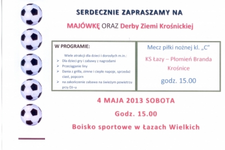 W sobotę 4 maja na godz. 15.00 zapraszamy wszystkich sympatyków piłki nożnej na boisko sportowe w Łazach na Derby Ziemi Krośnickiej - mecz kl. "C" pomiędzy KS Łazy a Płomień Branda Krośnice.