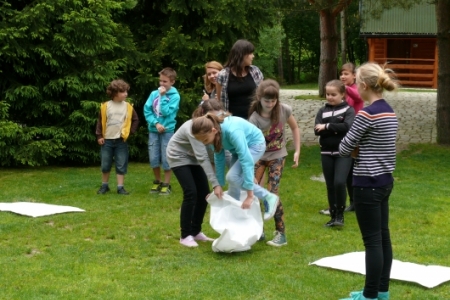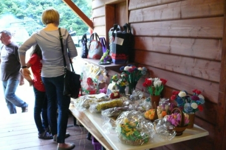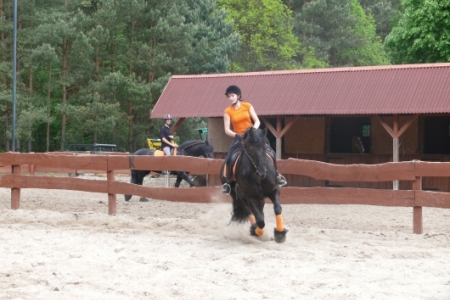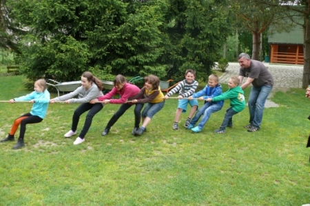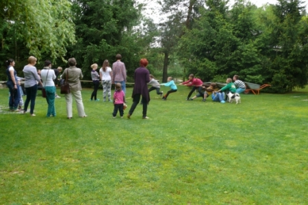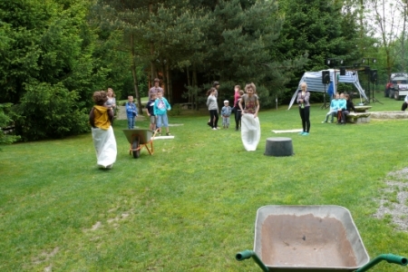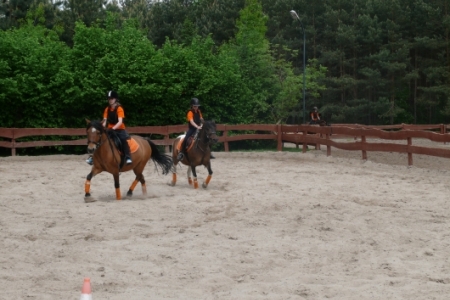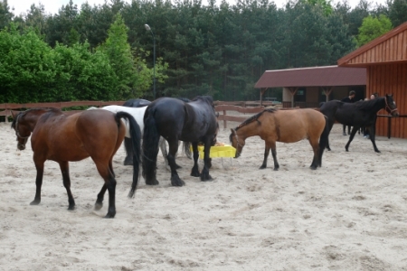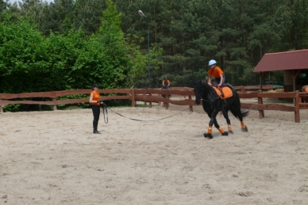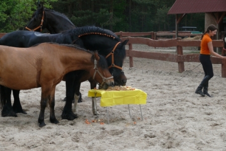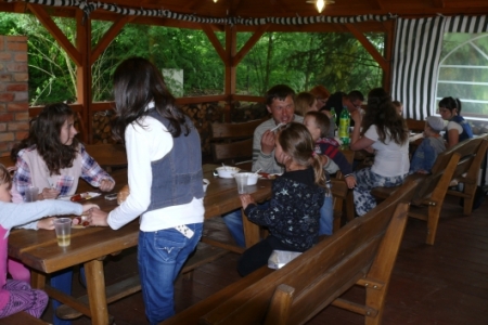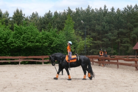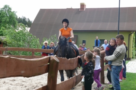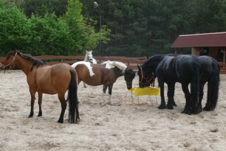 Po części oficjalnej przenieśliśmy się nad staw Państwa Stryjskich, gdzie goście mogli spróbować wyśmienitej grochówki, wybornych wędlin oraz obejrzeć i zakupić wyroby rękodzielnicze z naszego stoiska. Dla dzieci przygotowano wiele interesujących zabaw – było przeciąganie liny, skoki w workach i wiele innych. Na zakończenie wszystkie dzieciaki otrzymały słodki poczęstunek od właścicieli stajni.